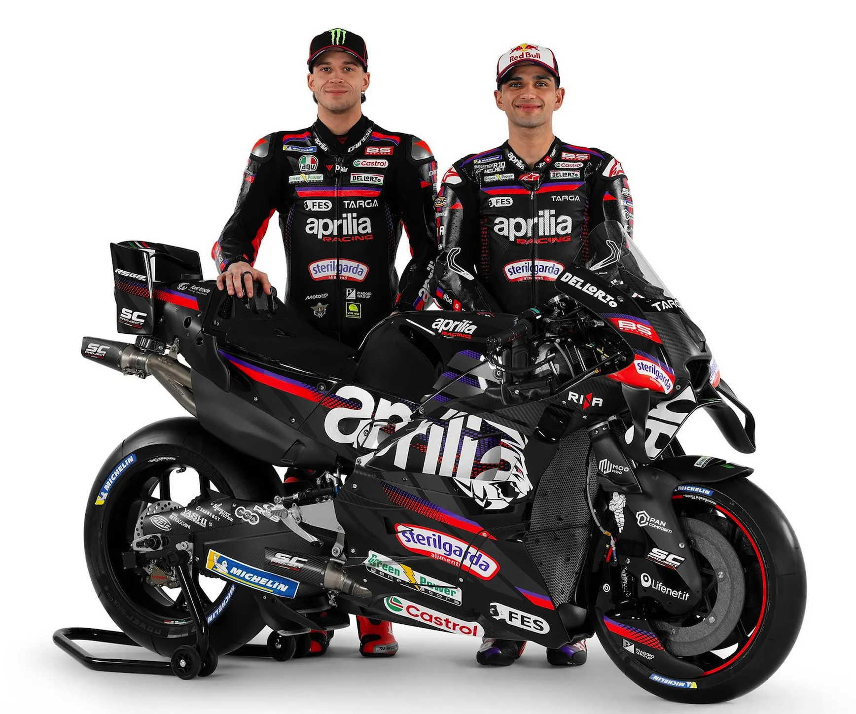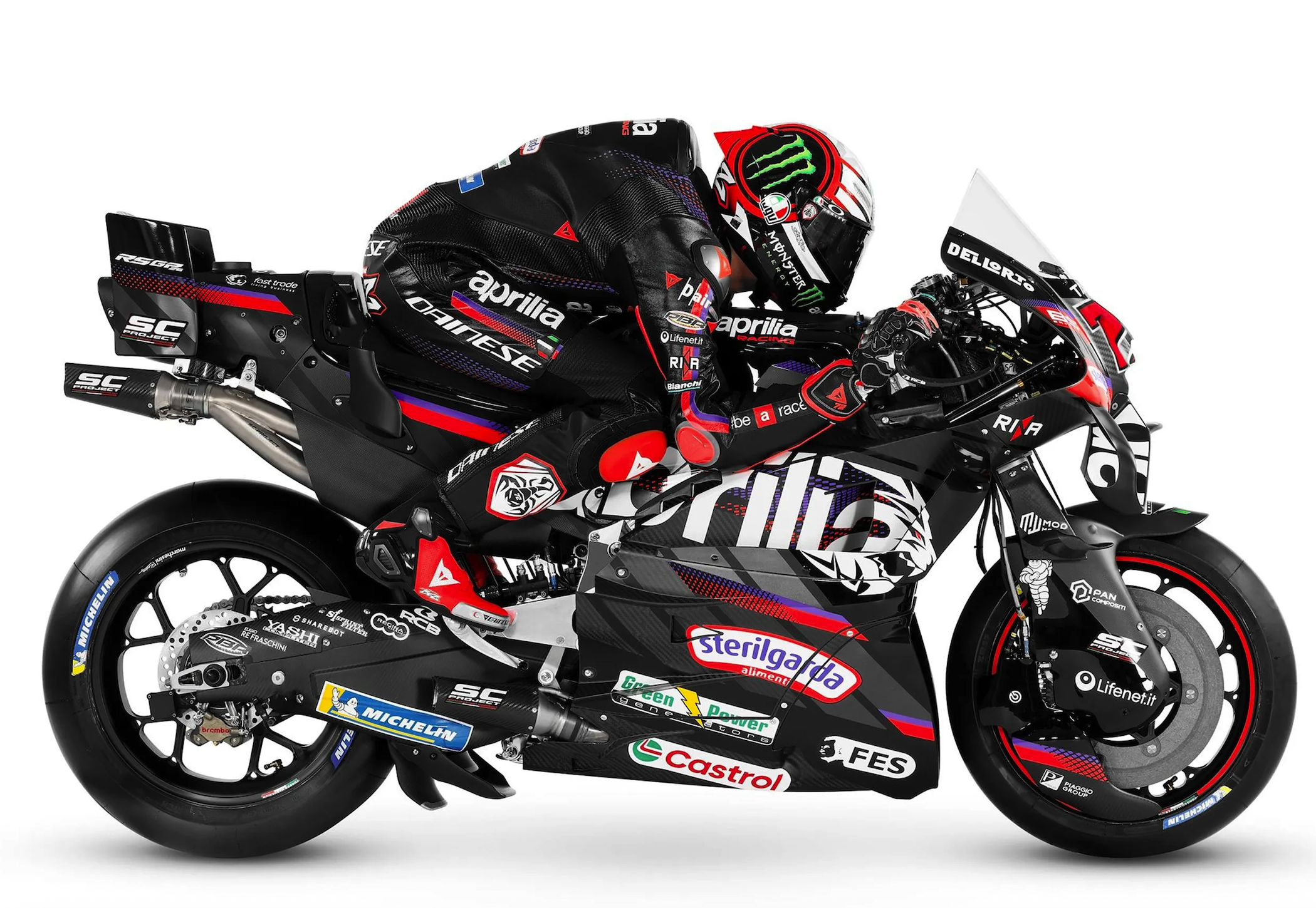 Logo Aprilia pun tampil berbeda, dengan tulisan putih dan kepala singa ikonik yang menggantikan huruf "A", mempertegas identitas historis pabrikan Italia tersebut.
