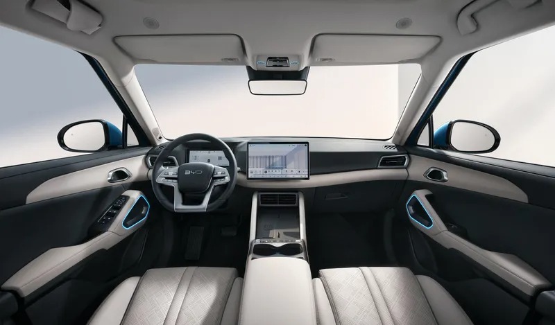 Area kabin, terdapat layar sentuh 12,8 inci, jok dengan kulit vegan, ambient light, panoramic sunroof, tempat penyimpanan termasuk kompartemen kaca mata, hingga pengisian daya ponsel nirkabel.