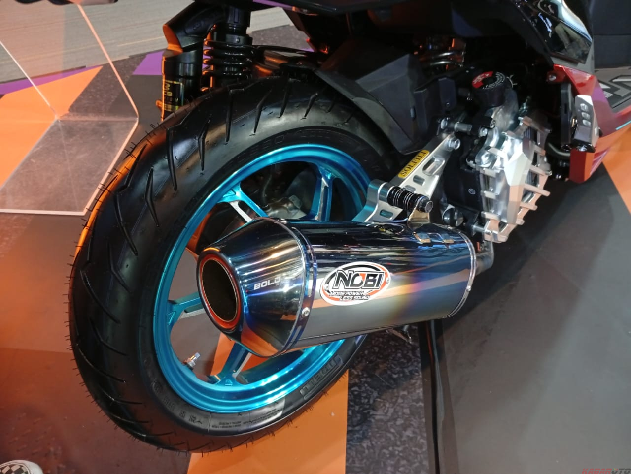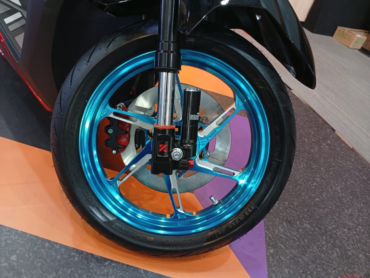 Komposisi ini dipadukan dengan ban tebal Pirelli Diablo Rosso Sport ukuran 100/70-14 di depan dan 130/70-14 di belakang. Pelek diganti menggunakan cast wheel RCB CT600 14 inci yang kemudian dicat ulang dengan warna biru untuk meningkatkan kesan premium.