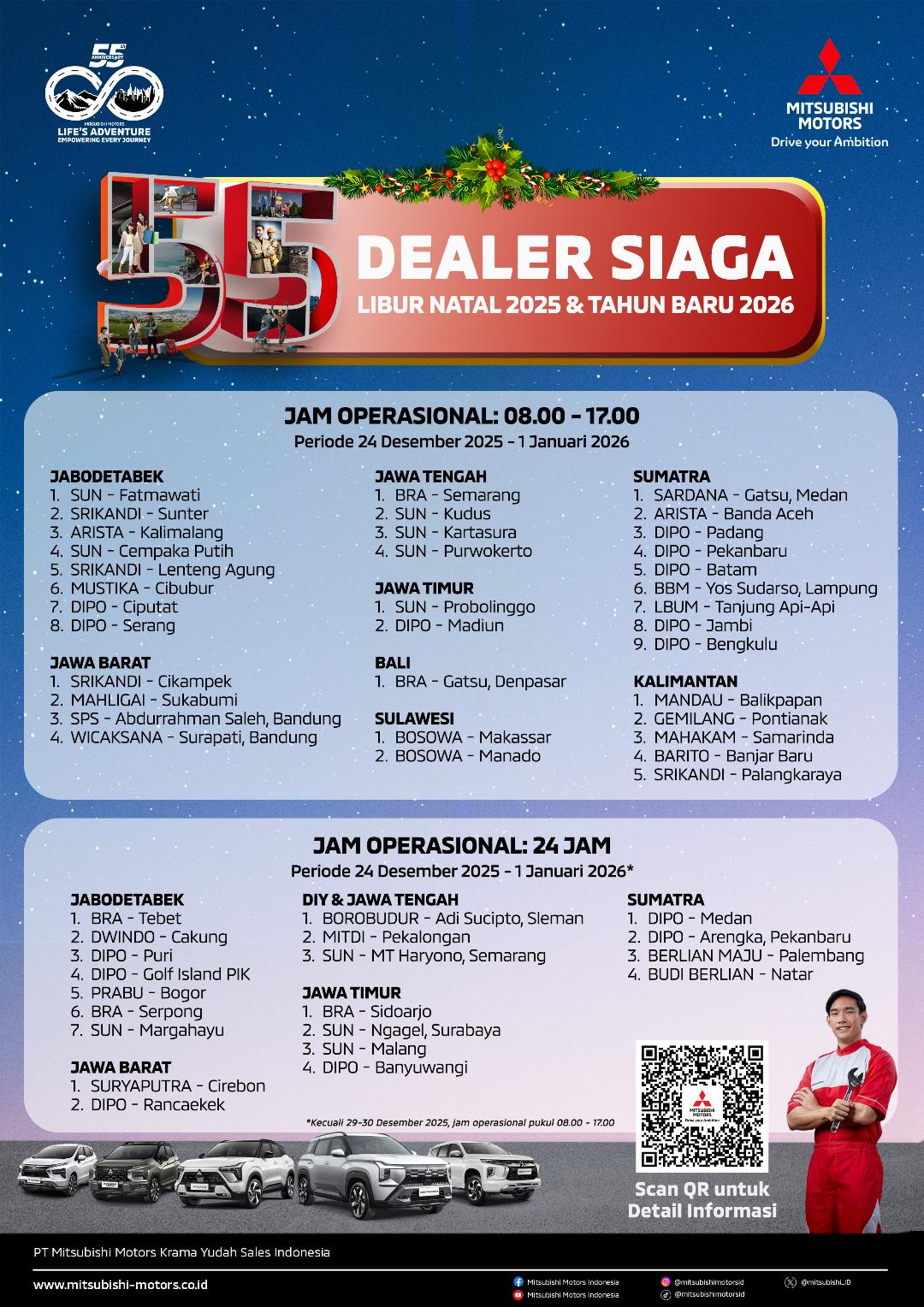 Menjawab kebutuhan tersebut, PT Mitsubishi Motors Krama Yudha Sales Indonesia (MMKSI) menghadirkan Program Diler Siaga Natal & Tahun Baru 2026, yang berlangsung pada 24 Desember 2025 hingga 1 Januari 2026 di 55 diler resmi Mitsubishi Motors, dengan jam operasional yang disesuaikan.