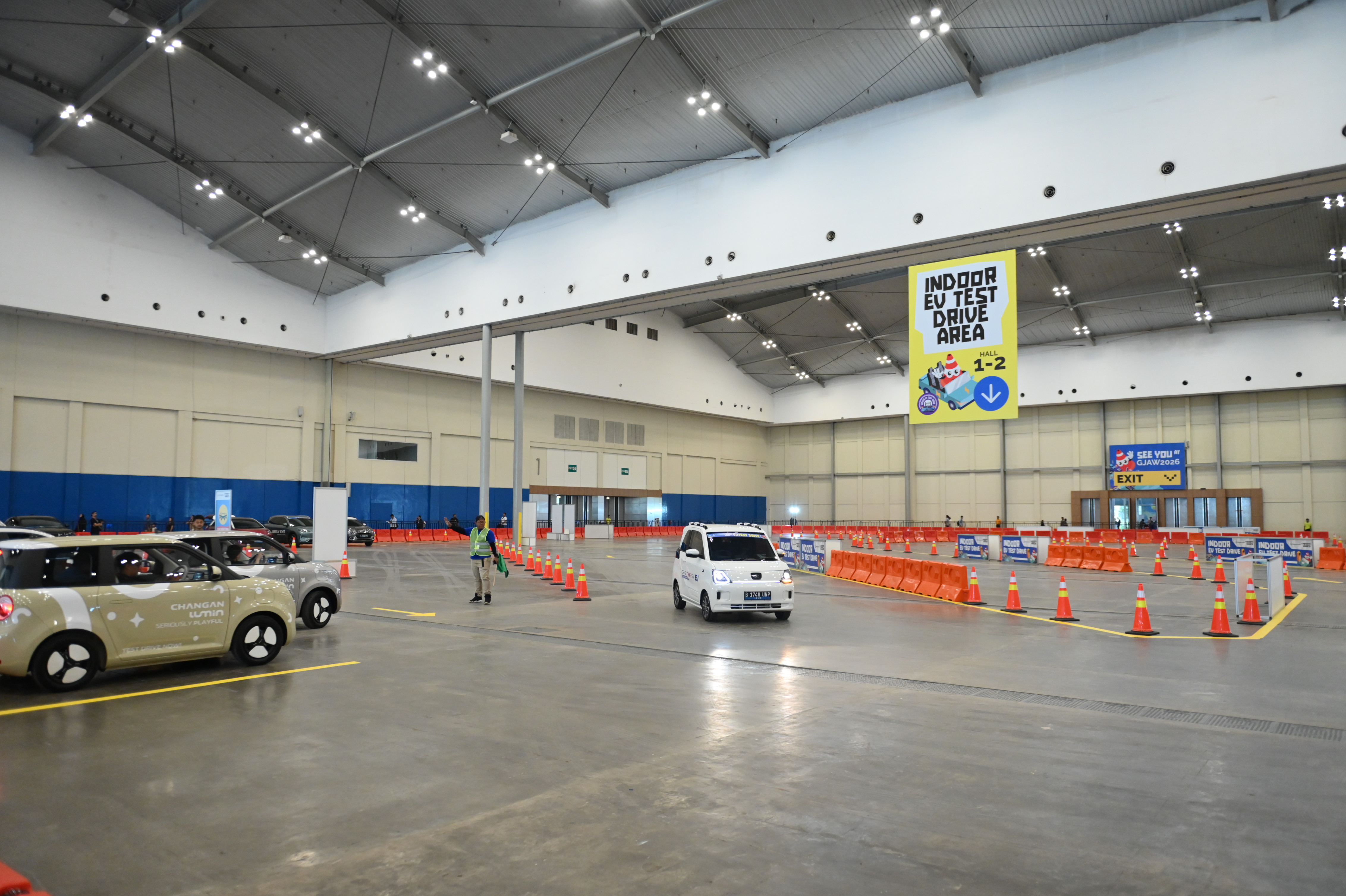 Kehadiran area mencoba khusus kendaraan listrik di dalam ruangan ini memberikan kenyamanan lebih bagi pengunjung untuk merasakan langsung teknologi berkendara terbaru tanpa harus keluar dari area utama pameran.