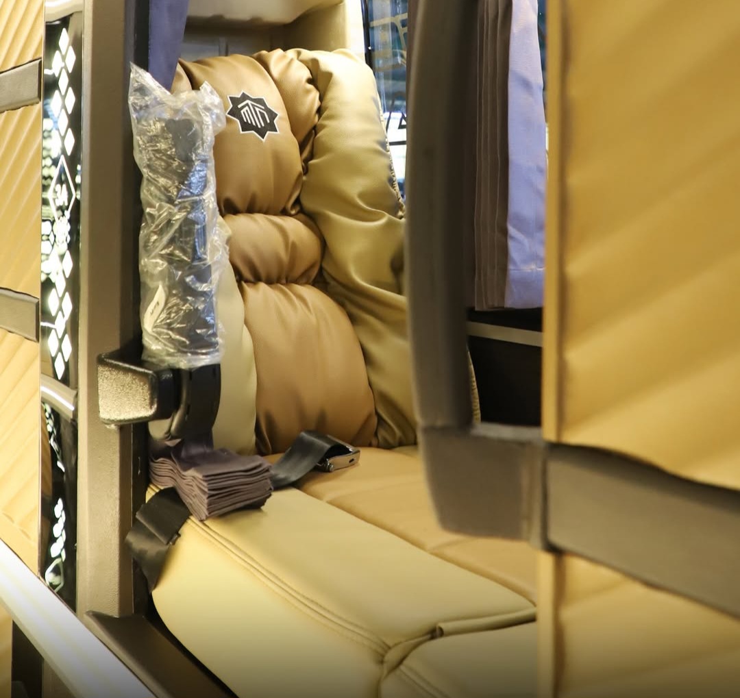 Kemudian pada kabin belakang, terdapat kursi sleeper dengan konfigurasi 1-2 serta sandaran yang menyerupai sofa. Pada kabin ini penumpang bakal merasakan kenyamanan maksimal karena didukung oleh kursi yang empuk dan nyaman.