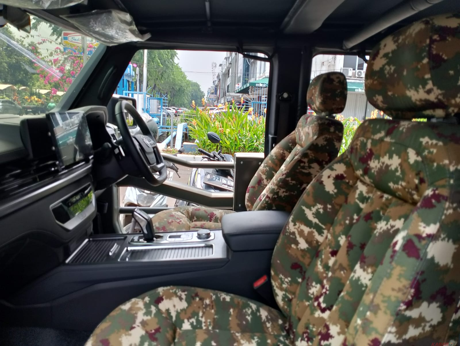 Masuk ke area kabin, terdapat dasbor kurang lebih sama dengan mobil dinas yang dipersiapkan oleh Menteri di Kabinet Merah Putih. Berkapaitas empat orang penumpang, joknya model captain seat dengan aksen loreng.