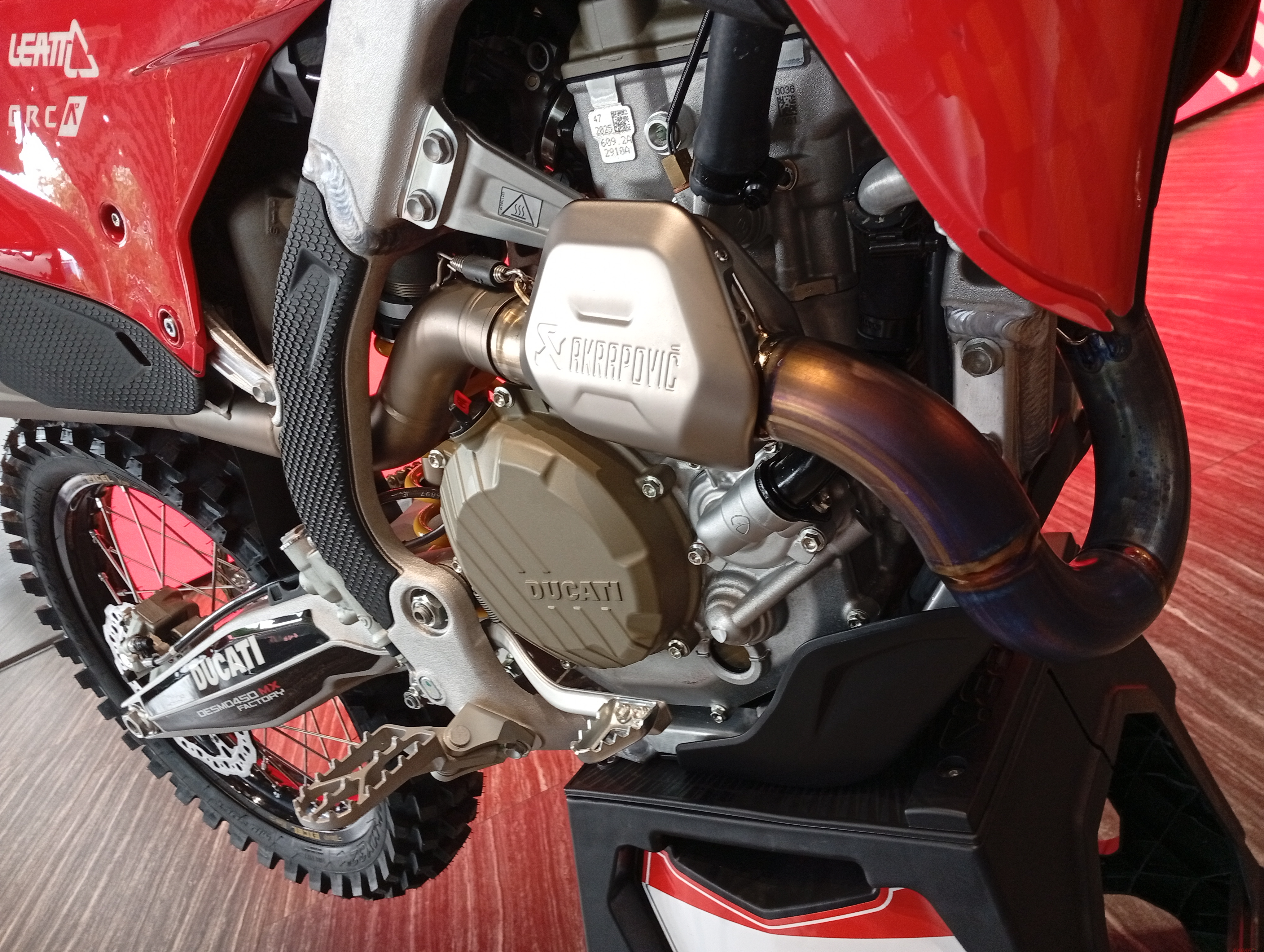 Desmo450 MX Factory dilengkapi knalpot titanium Akrapovic, dengan mapping mesin khusus. Sistem ini mengurangi bobot 1,7 kg, meningkatkan penyaluran tenaga, serta menawarkan kurva torsi yang lebih padat dan bertenaga.