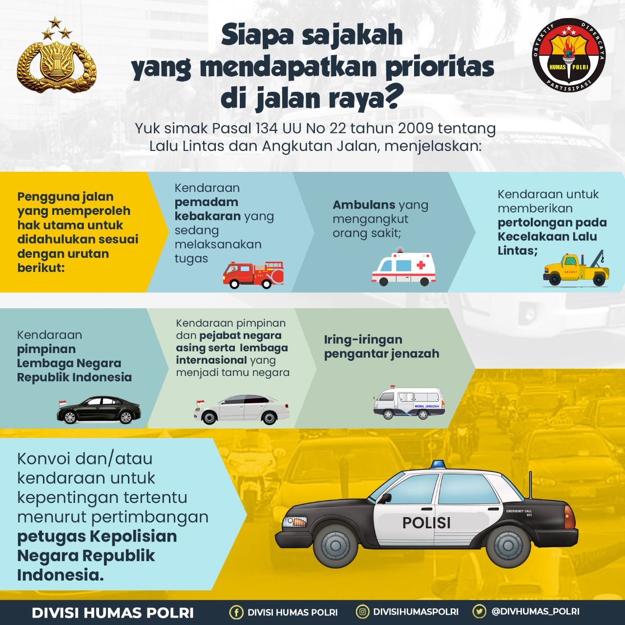 Tertuang dalam Pasal 134 UU No 22 tahun 2009 tentang Lalu Lintas dan Angkutan Jalan, terdapat 7 kendaraan prioritas yang perlu diberikan jalan terlebih dulu, salah satunya Pimpinan Lembaga Negara Republik Indonesia dan Ambulans yang tengah mengangkut orang sakit.
