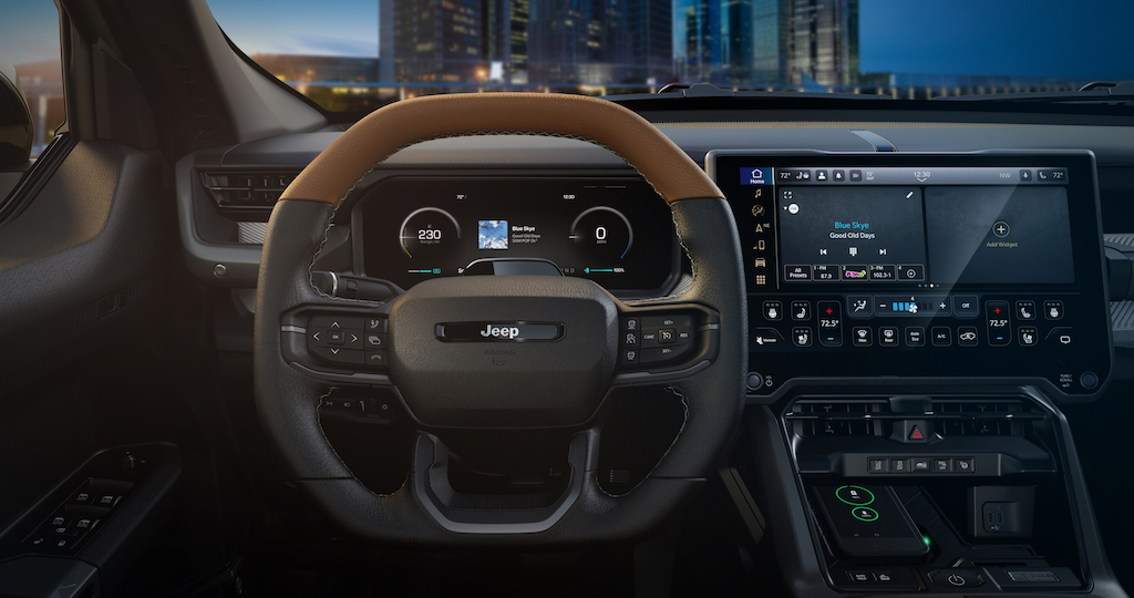 Tatanan kabin Jeep Recon memadukan utilitas yang tangguh dengan inovasi yang halus. Desain horizontal ikonik dipadukan dengan konsol tengah pass-through dua tingkat yang menawarkan ruang penyimpanan luas, termasuk wireless charger di bagian atas.
