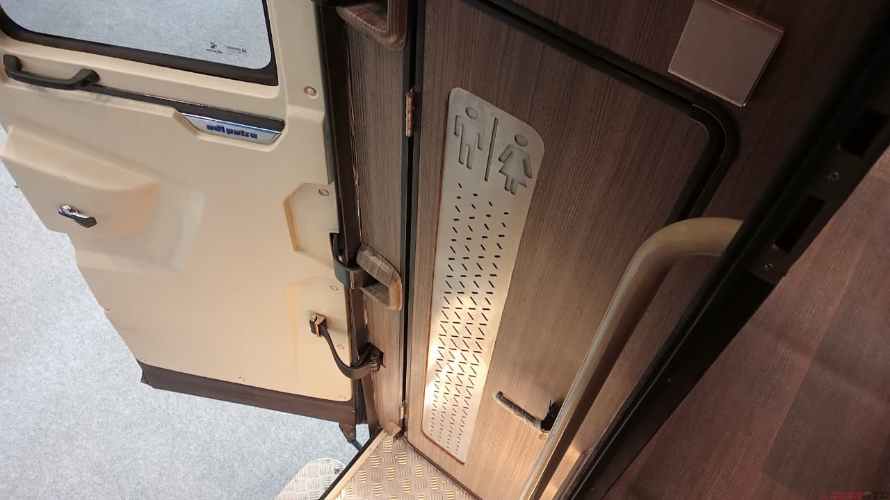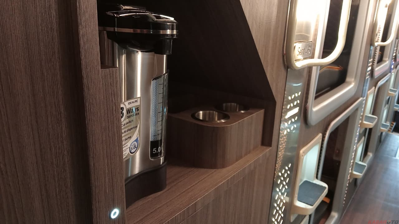Untuk menunjang kebutuhan selama perjalanan, bus ini juga menyediakan toilet yang bersih dan terpisah, serta dispenser air minum untuk memastikan hidrasi penumpang selalu terjaga tanpa perlu repot. selama perjalanan.
