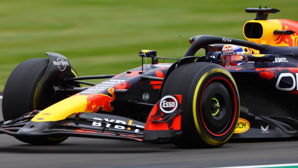 Verstappen kehilangan kendali atas RB20-nya di tikungan Copse, saat para pembalap beralih dari ban medium ke ban slick di sesi basah-kering, membuatnya keluar lintasan dan menabrak jebakan kerikil.