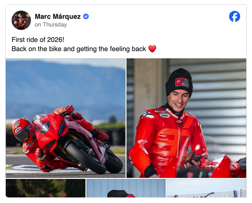 Pada kesempatan tersebut, Marquez mengendarai Ducati Panigale V2 di Sirkuit Aspar, Valencia, meski kondisi cuaca terbilang dingin. Latihan ini berlangsung di hari yang sama saat Fermin Aldeguer mengalami cedera patah tulang paha.