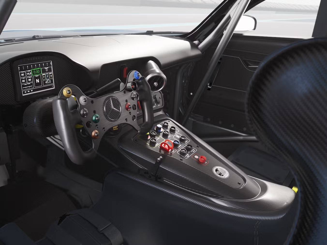 Kokpit Mercedes-AMG GT3 meyakinkan dengan ergonomi yang sempurna dan suasana mobil balap yang fungsional, setiap detail telah dipikirkan dengan matang dan dioptimalkan untuk tujuannya, semuanya bertujuan untuk kemudahan penggunaan maksimal. Elemen sentral di interior adalah sel keselamatan karbon, fitur unggulan lain di GT3.