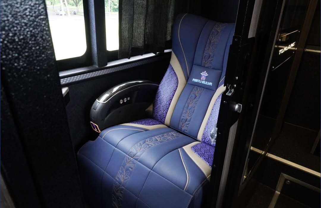 Kemudian jika masuk ke kabinnya, pada bagian depan terdapat kursi sleeper Grand Captain sebanyak dua buah, disusul di belakangnya terdapat kursi eksekutif sebanyak 12 dengan konfigurasi 2-2 menggunakan legrest.