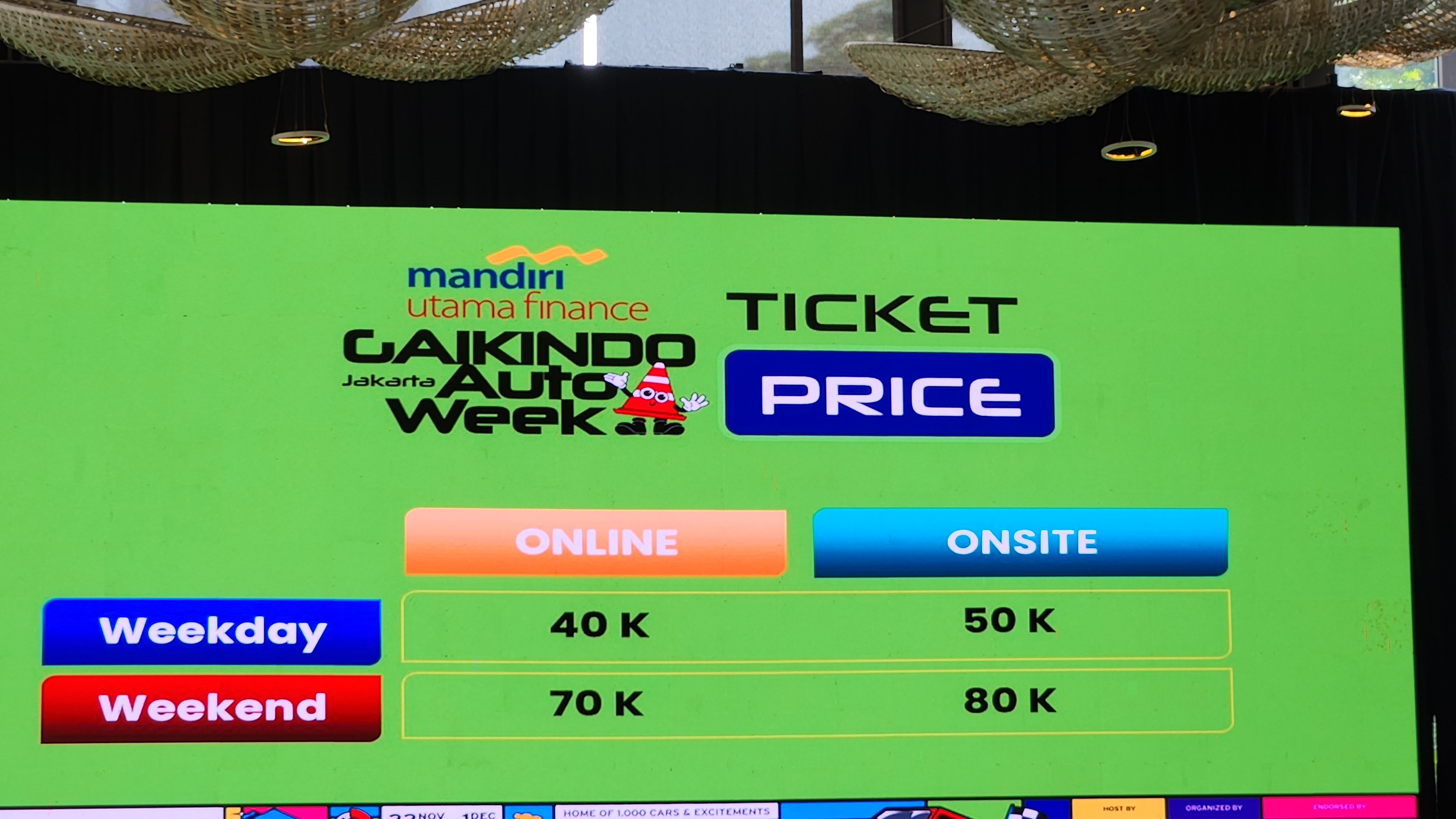 Tiket dapat dibeli mulai 14 November 2024 melalui aplikasi Auto360 atau di lokasi pameran di hall 5, 7, dan 10. Harga tiket weekday secara online adalah Rp 40.000 dan weekend Rp 70.000.