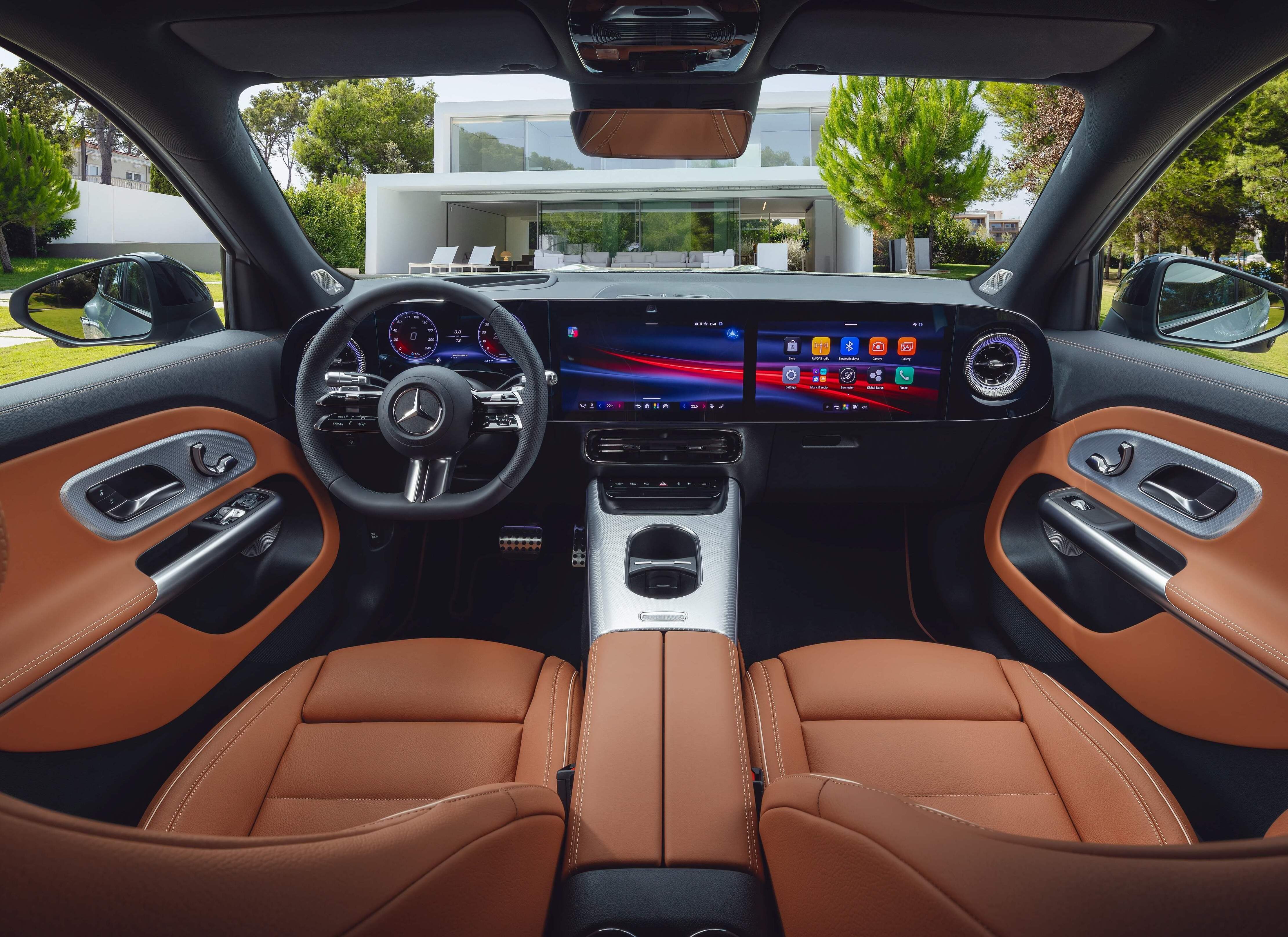 Masuk ke bagian interior, GLB baru mengadopsi sistem Superscreen tiga layar, yakni kluster digital 10,25 inci, layar infotainment sentuh tengah 14 inci, dan layar penumpang opsional 14 inci. Seluruh sistem infotainment menggunakan operasi superkomputer baru Benz, MB.OS, dan dilengkapi asisten suara berbasis AI.