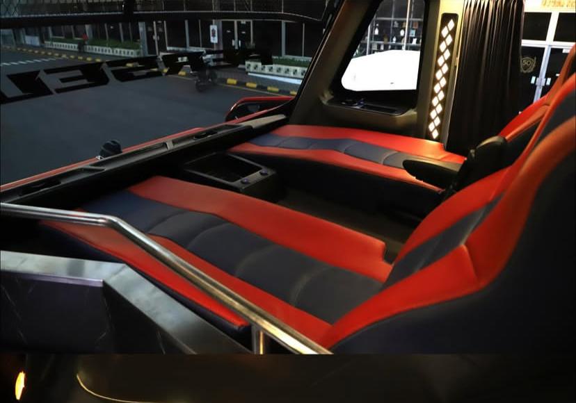 Memasuki area kabin, menghadirkan nuansa interior mewah denggan aksen kayu di lantai dan aksen batu granit di bagian dinding. Menariknya, bagian kursi depan sleeper untuk dua penumpang.