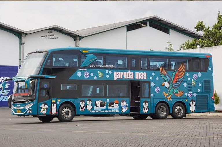 Tampilan eksteriornya kini dibuat berbeda, karena dicat ulang. Kini, bus double decker PO Garuda Mas ini hadir lebih berwarna dan ceria dengan banyaknya ikon gambar disematkan.