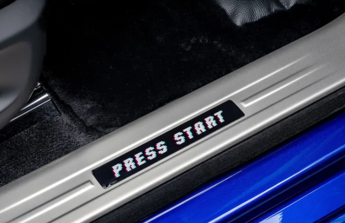 Saat pintu mobil terbuka, penumpang langsung disambut oleh Bespoke Illuminated Treadplates yang menampilkan prompt khas game arcade klasik, PRESS START, LOADING…, LEVEL UP, dan INSERT COIN.
