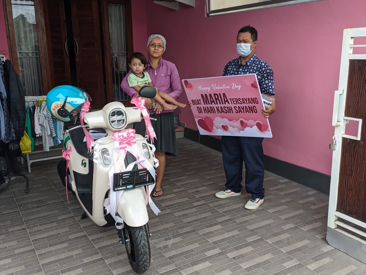 Kejutan kepada pasangan tidak saja dilakukan oleh remaja, tapi untuk semua kalangan usia. Seperti pria bernama Edo, yang memberikan kejutan kepada istrinya berupa satu unit Yamaha Fazzio Neo berwarna Beige.