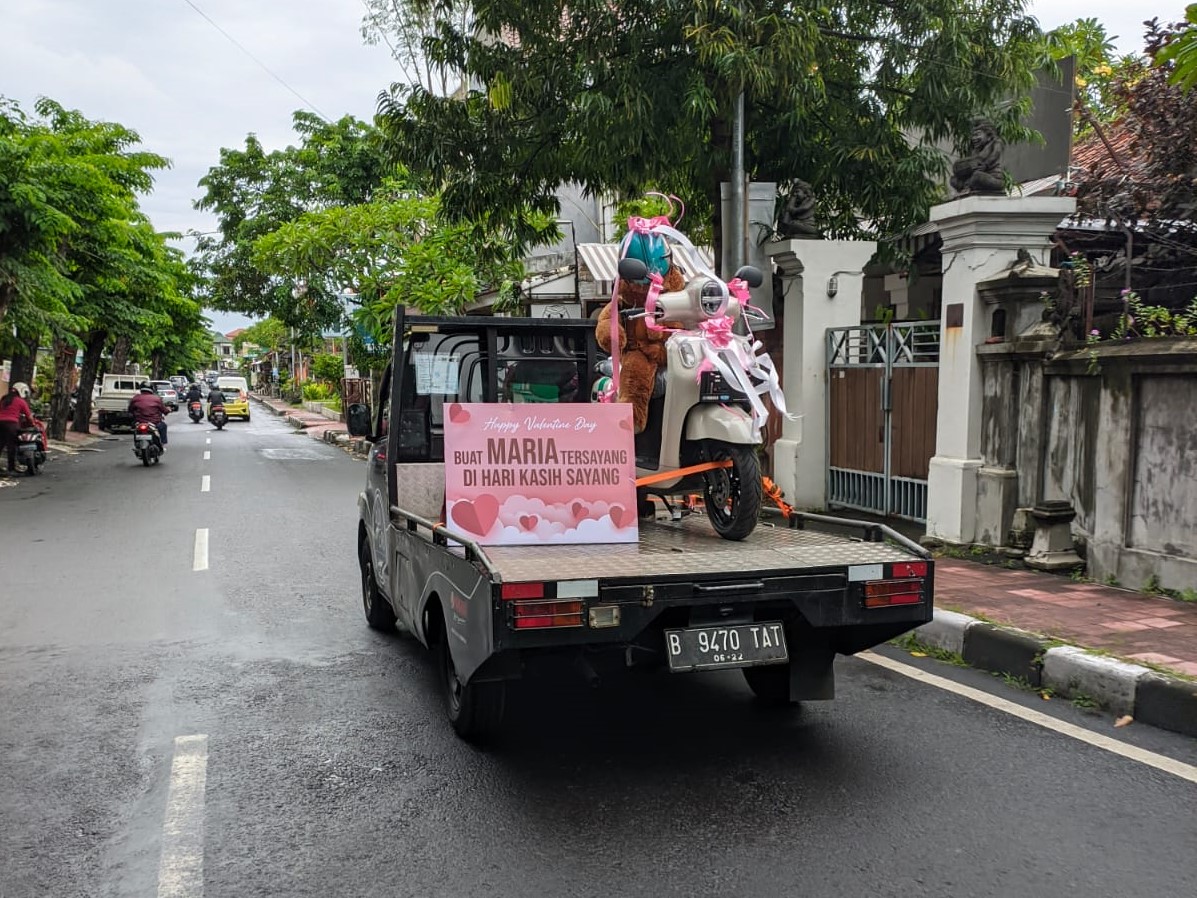 Uniknya, pria 37 tahun itu meminta pengirimannya harus spesial dengan tambahan hiasan dan boneka besar. Pengiriman dari Yamaha Flagship Shop Bali tersebut, sebelumnya di hias dengan pita yang cantik berikut boneka beruang besar menggunakan helm duduk diatas motornya serta ucapan yang romantis.