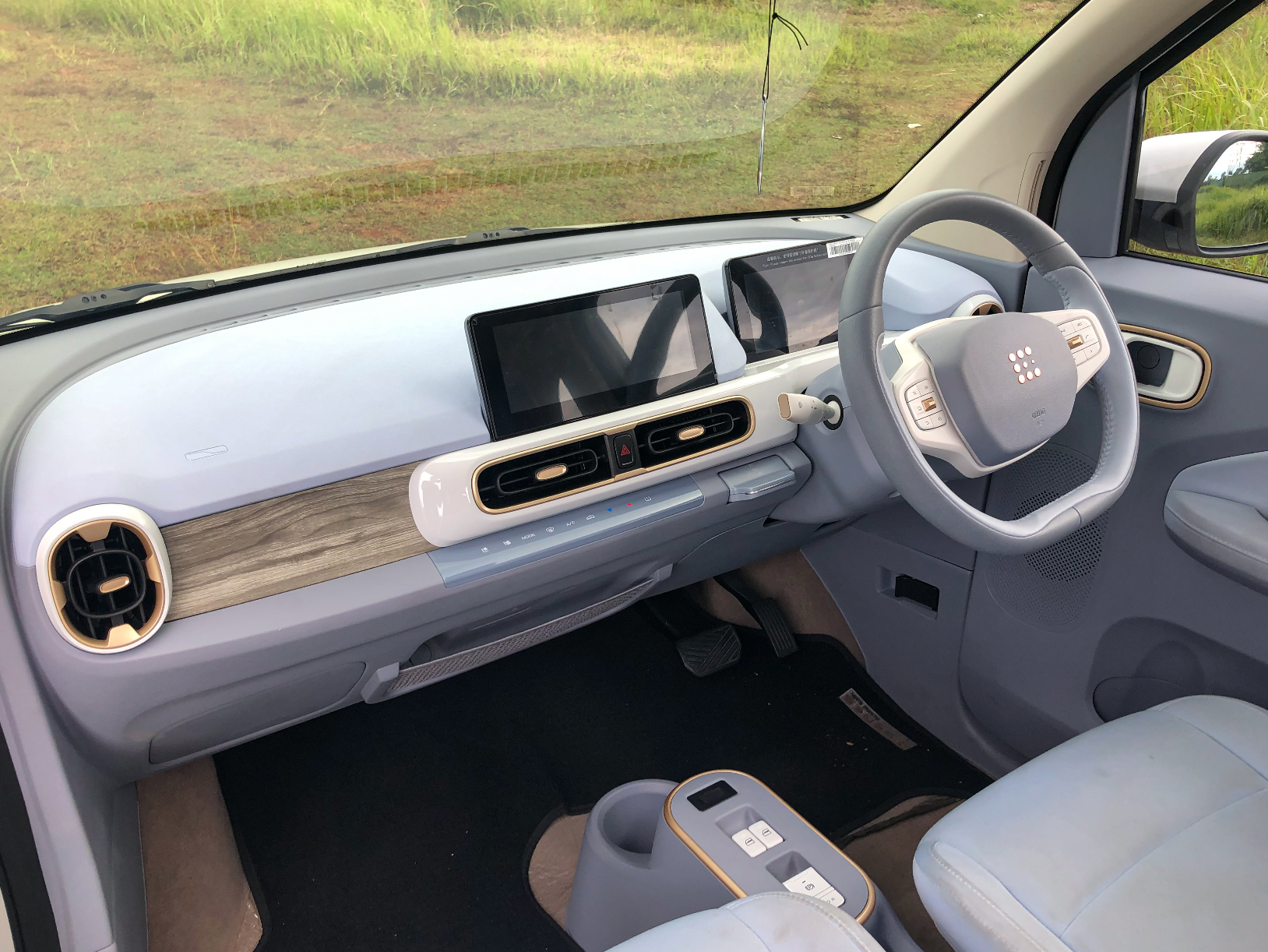 Head unit 8 inci mendukung koneksi Bluetooth dan kamera mundur, sementara panel instrumen 7 inci menampilkan data konsumsi listrik, kecepatan rata-rata, dan status baterai. Kekurangan ada pada pengaturan AC touchscreen tanpa indikator fan speed, yang kurang intuitif bagi pengemudi.