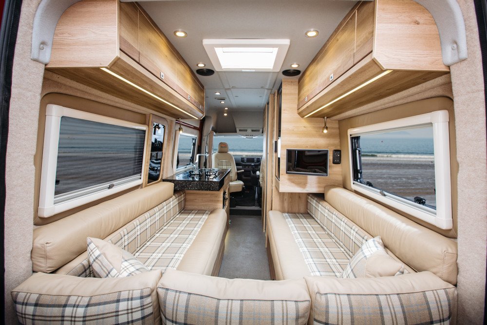 Kendaraan seperti Mercedes-Benz Sprinter, Volkswagen Crafter, atau varian van besar lainnya memungkinkan Anda untuk berdiri tegak di dalam kabin.