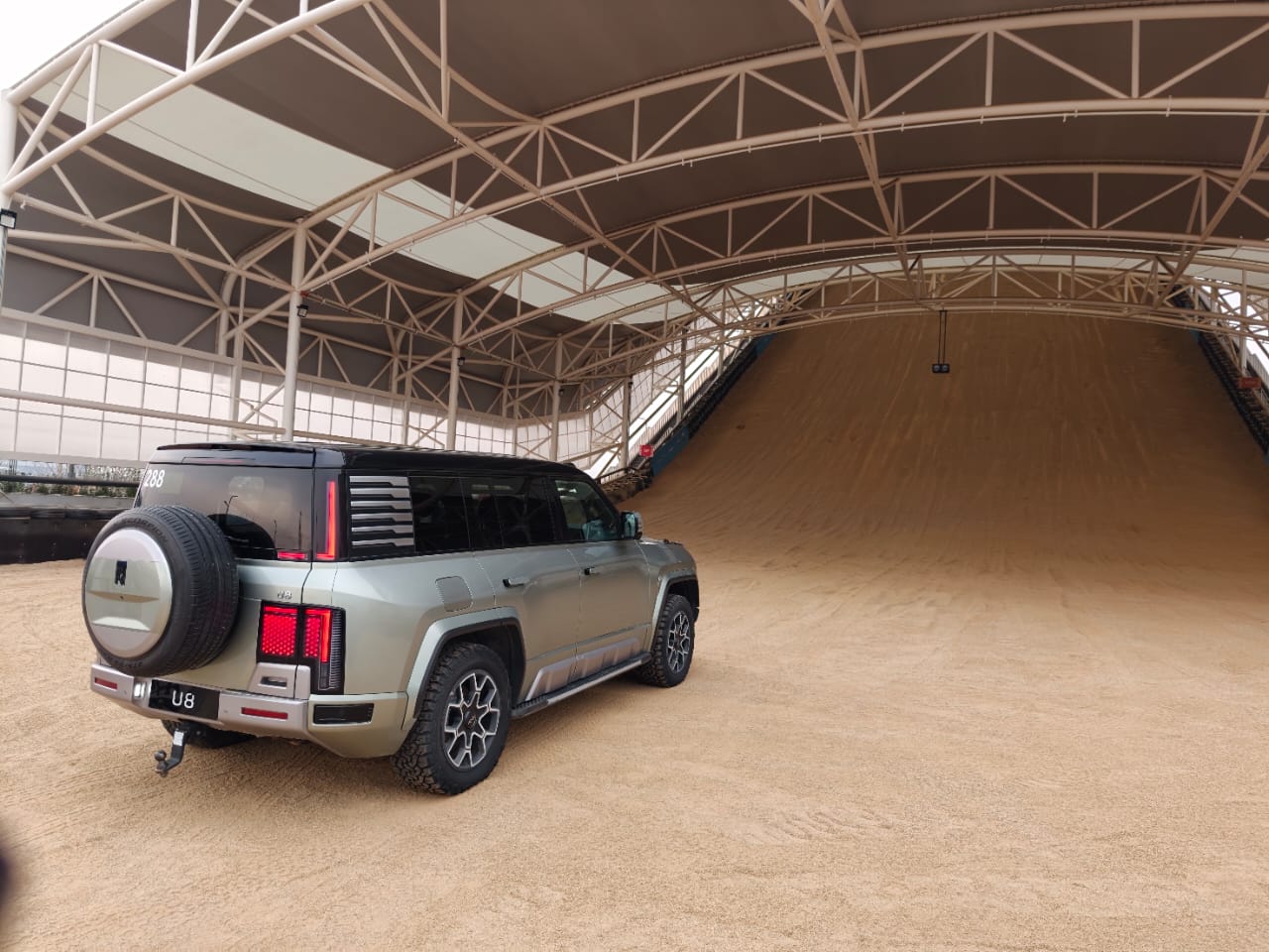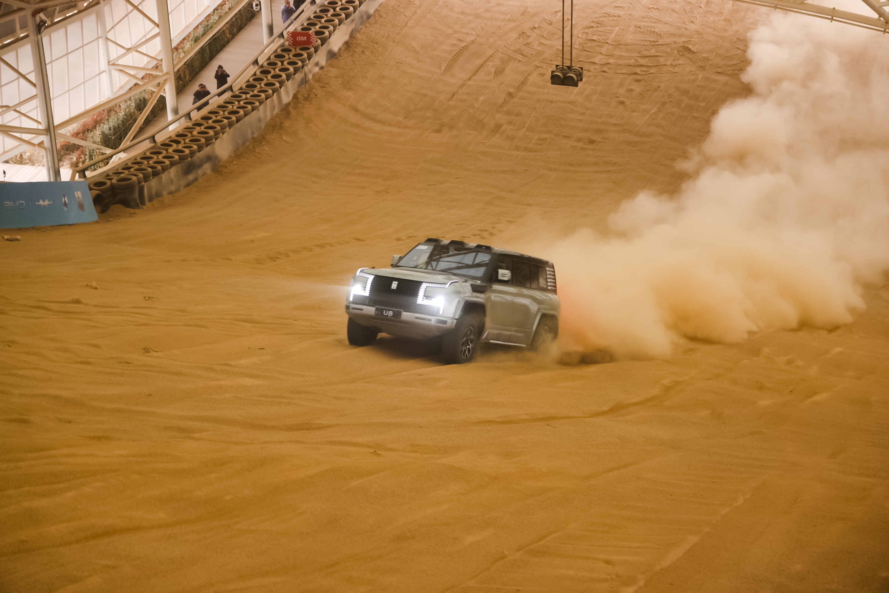 Dengan Yangwang U8 menaklukan medan berpasir dan menanjak, mensimulasikan medan berpasir dan tidak stabil, memungkinkan pengunjung merasakan secara langsung kemampuan kendaraan listrik dalam menjaga traksi dan distribusi tenaga pada permukaan dengan tingkat cengkeraman rendah.